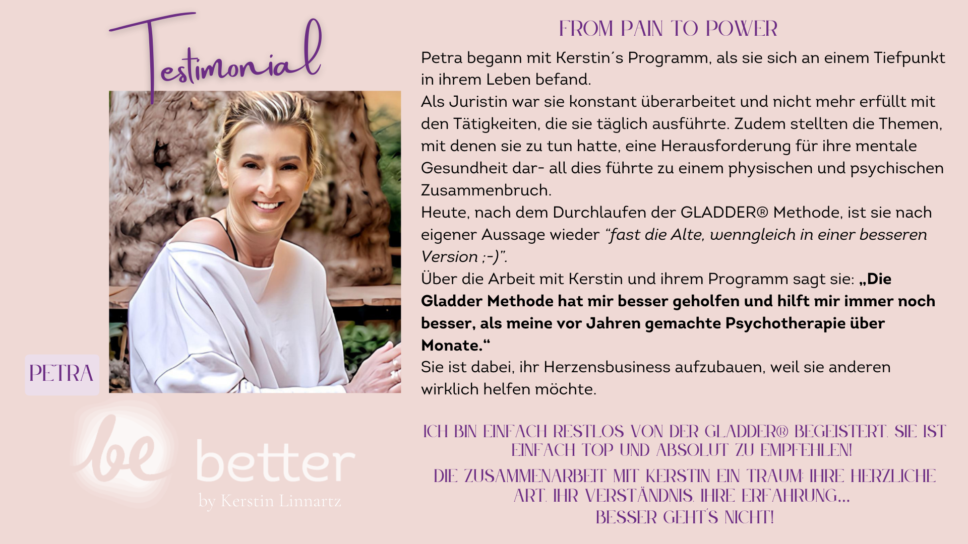 My GLADDER® Coaching Method combines established modern Techniques with ancient Science, Self-Development with Business-Strategy. I know that we need to develop ALL layers of the Self to be successful AND fulfilled. Book a free Call to learn more.