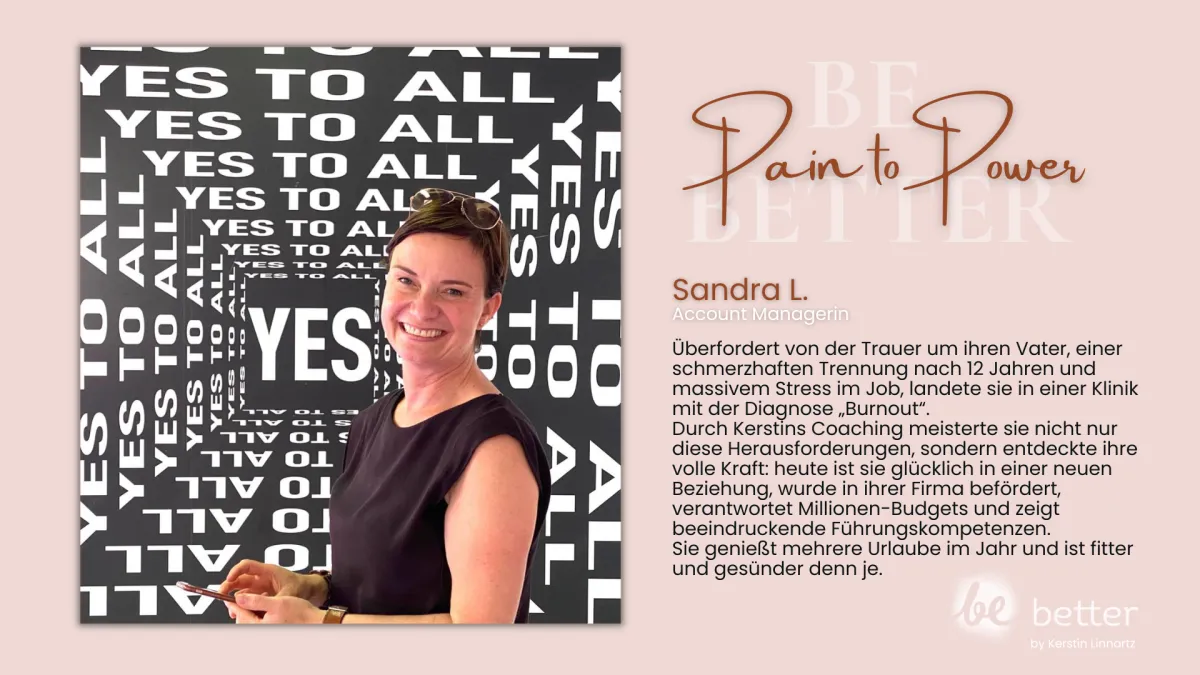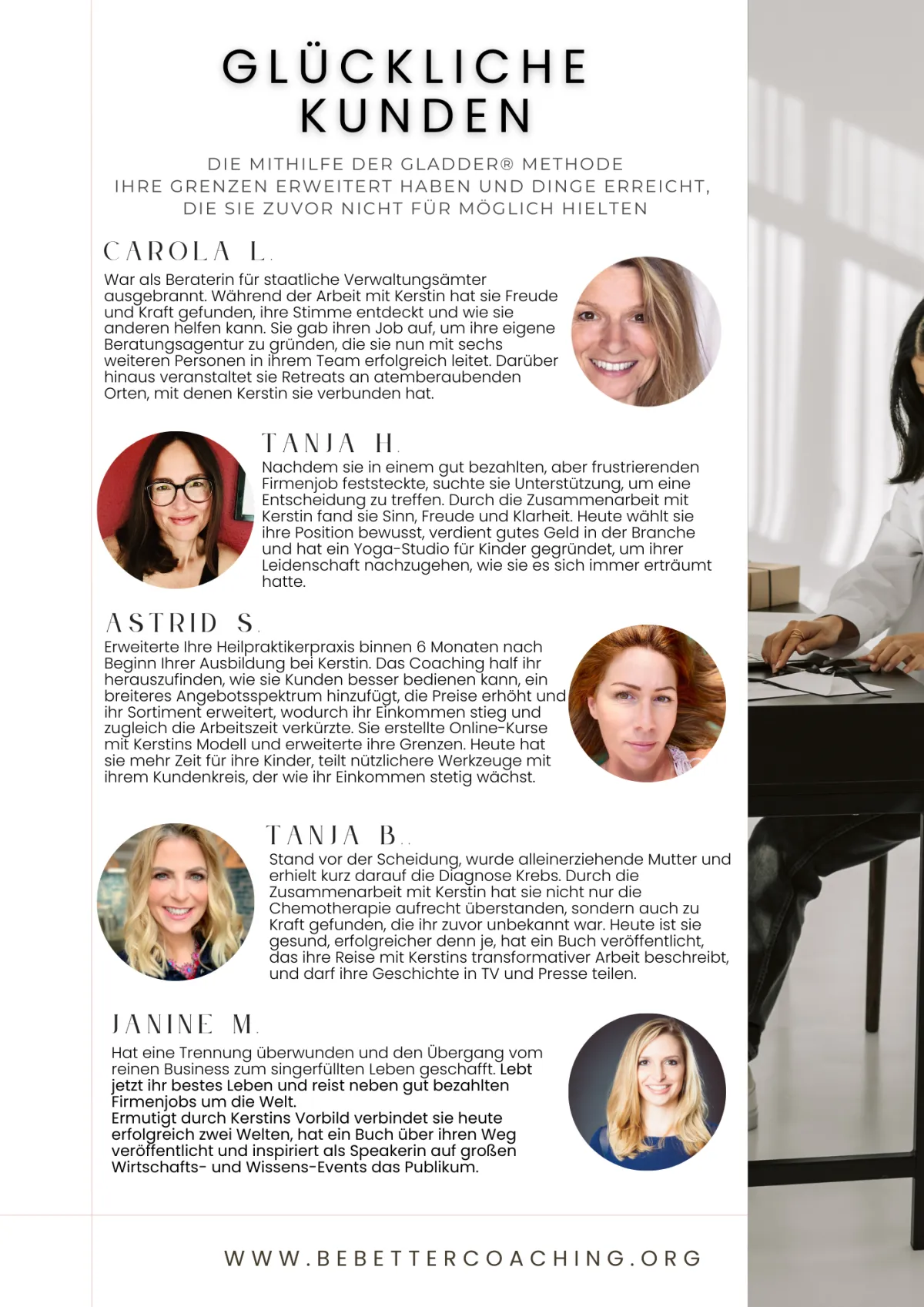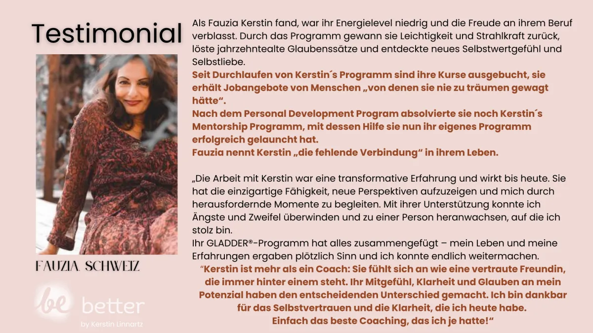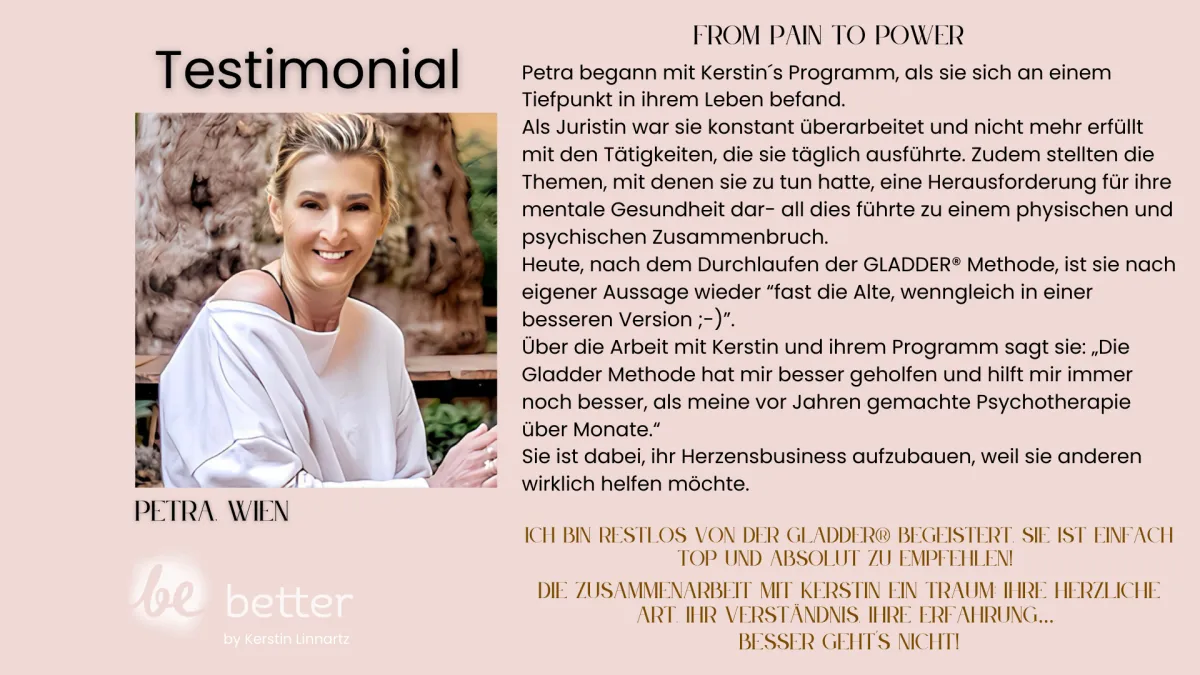Begann mit Kerstins Programm in einer persönlichen Krise: Überarbeitung und belastende Themen ihres juristischen Berufs hatten zum Burnout geführt. Durch die GLADDER® Methode fühlt sie sich heute wie „die Alte“ – jedoch in einer stärkeren, neuen Version – und baut nun ihr eigenes Herzensbusiness auf.