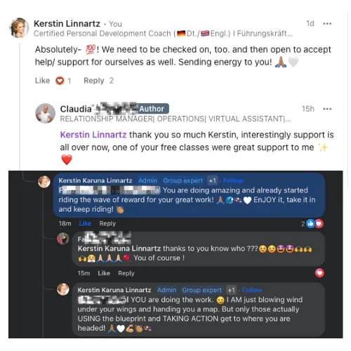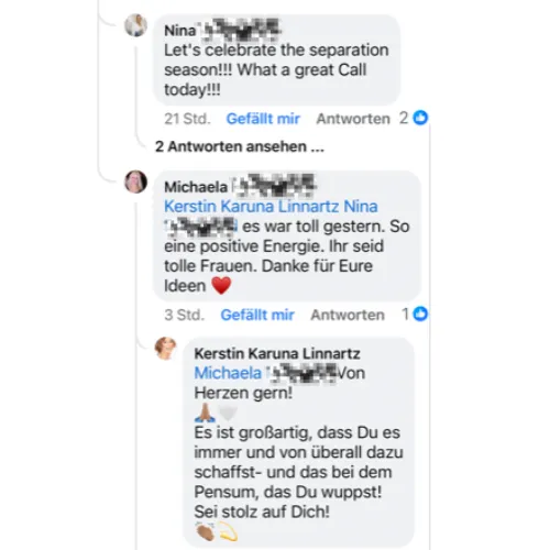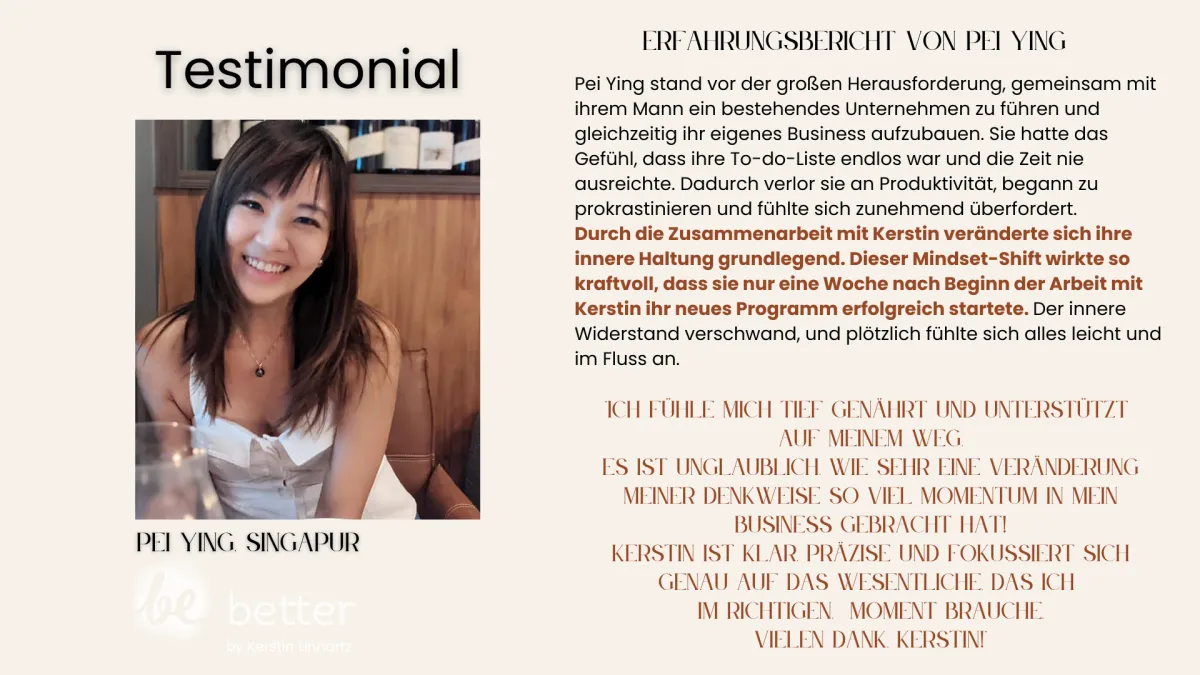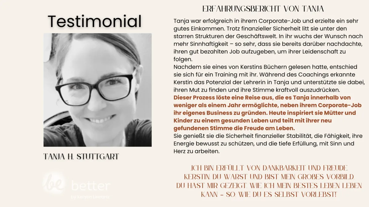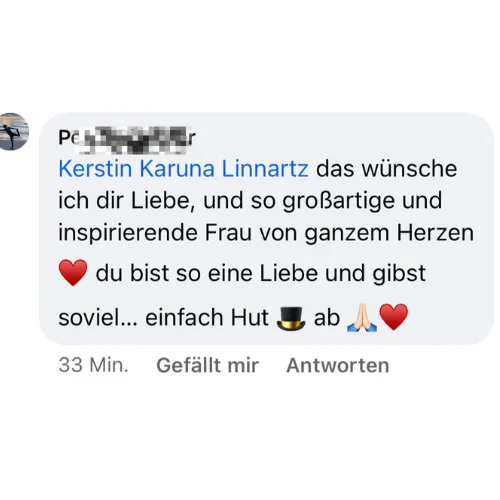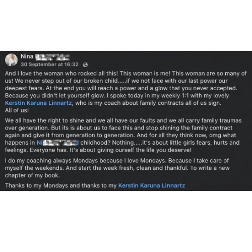 Nina liebt die wöchentlichen 1:1 Mentorship Calls bei Kerstin. Sie hat gelernt, sich Ängsten zu stellen und alte Muster zu durchbrechen. Für Nina bedeutet dieser Prozess, sich von alten Prägungen zu lösen und das Leben zu schaffen, das sie wirklich verdient. Sie beginnt heute ihre Wochen bewusst und ist dankbar, ein neues Kapitel ihres Lebens zu schreiben.