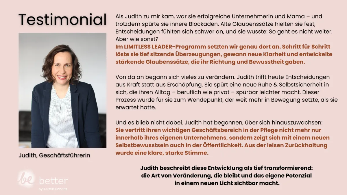 Judith erzählt von einem der entscheidenden Momente in unserem Programm, durch den sie verstand, wie sehr alte Glaubenssätze sie zurückhielten. Dieser Shift brachte ihrem Leben mehr Klarheit, Selbstvertrauen und Mut, Entscheidungen zu treffen, die wirklich zu ihr passen. Heute lebt sie bewusst, kraftvoll und mit einer Haltung, die über ihr Business hinaus wirkt.
